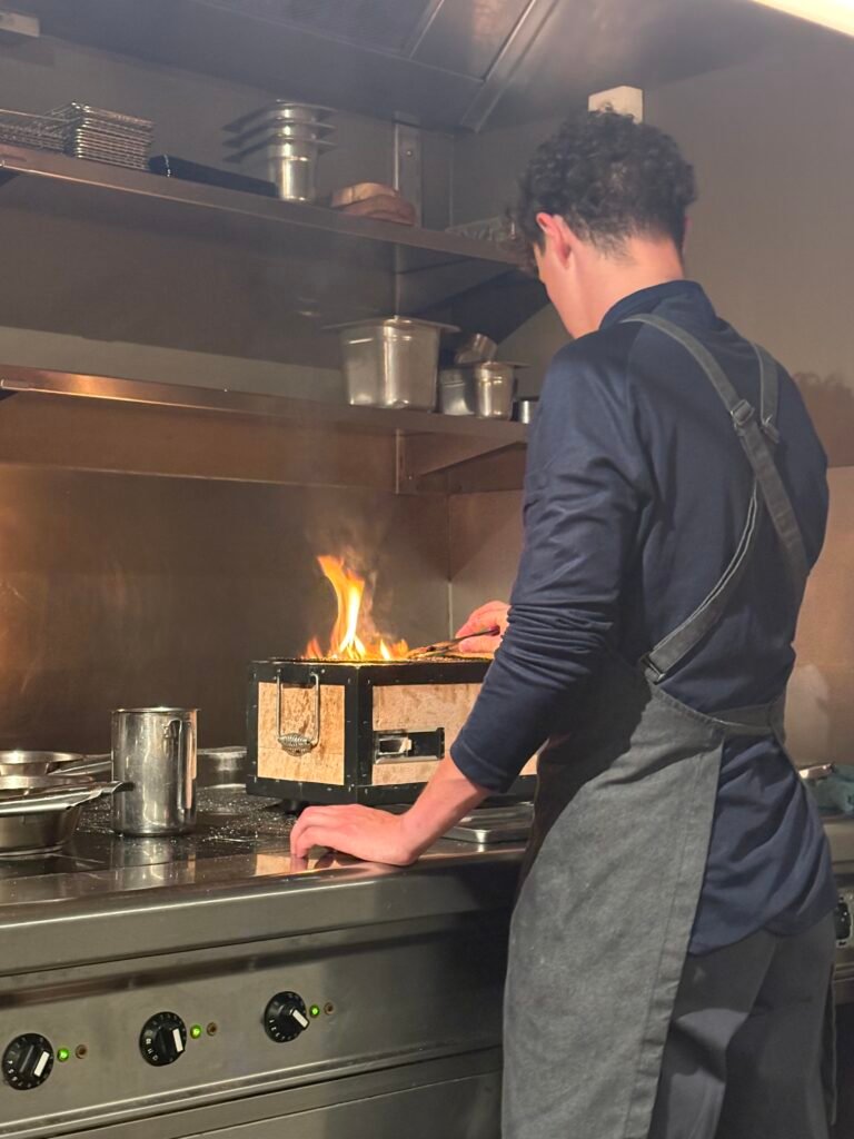 Trois coups retentissent, le rideau s’ouvre, et l’émotion s’installe — immédiate, délicate, profonde. Le rituel démarre avec une coupe de champagne ou une boisson non-alcoolisée. Devant vous : deux cuisiniers et un maître de cérémonie qui présente l’expérience. Jayu déroule alors son récit : douze services, deux heures, un entracte, un voyage.